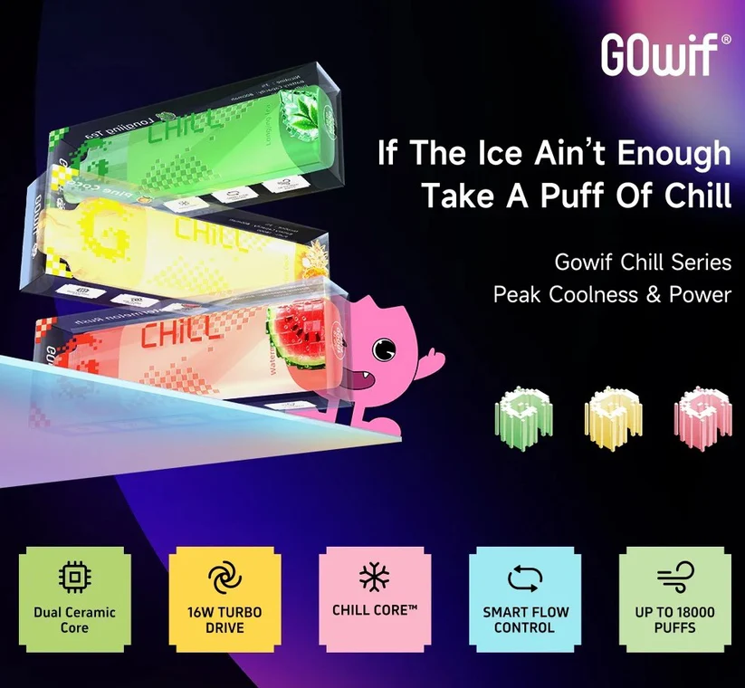 Authentic GOwif Chill series 18000 puffs dual ceramic core turbine high-power transparent oil tank with battery and oil level display, long battery life disposable e-cigarette – multiple flavors available.