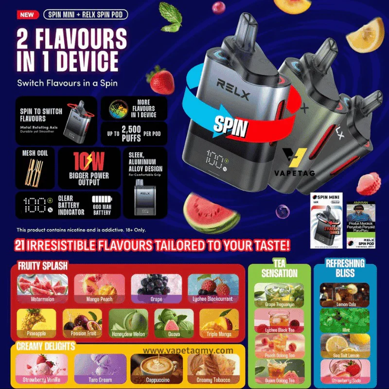 The RELX Spin Mini Lux is designed for a relaxed and enjoyable e-cigarette experience. Its “one device, two flavors” feature allows users to explore two different flavors in one device without changing cartridges.